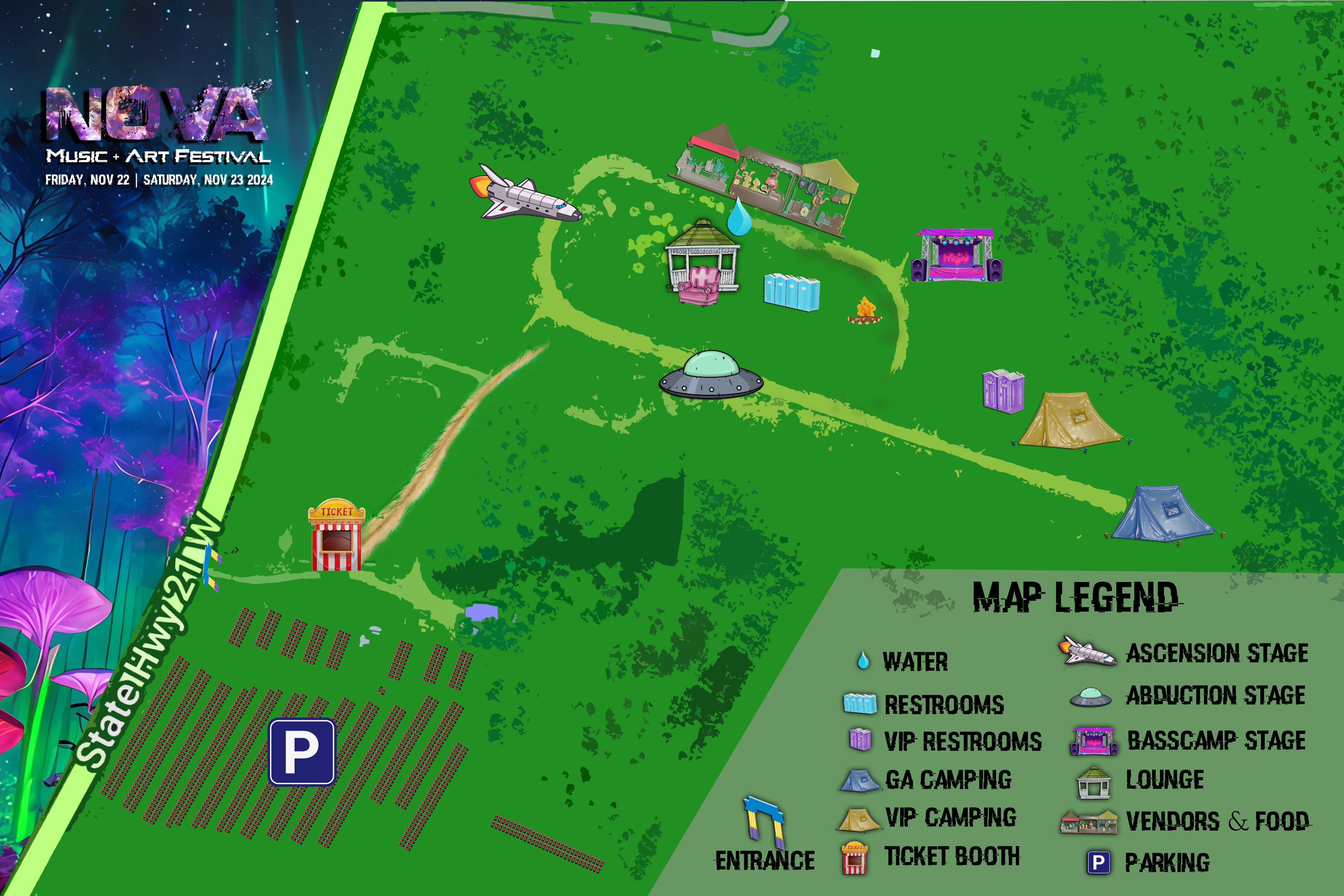 From Dallas: Take I-45 S to exit 142 and make a right onto TX-21 E. Continue on TX-21 E for 10 miles, festival entrance will be on the right.